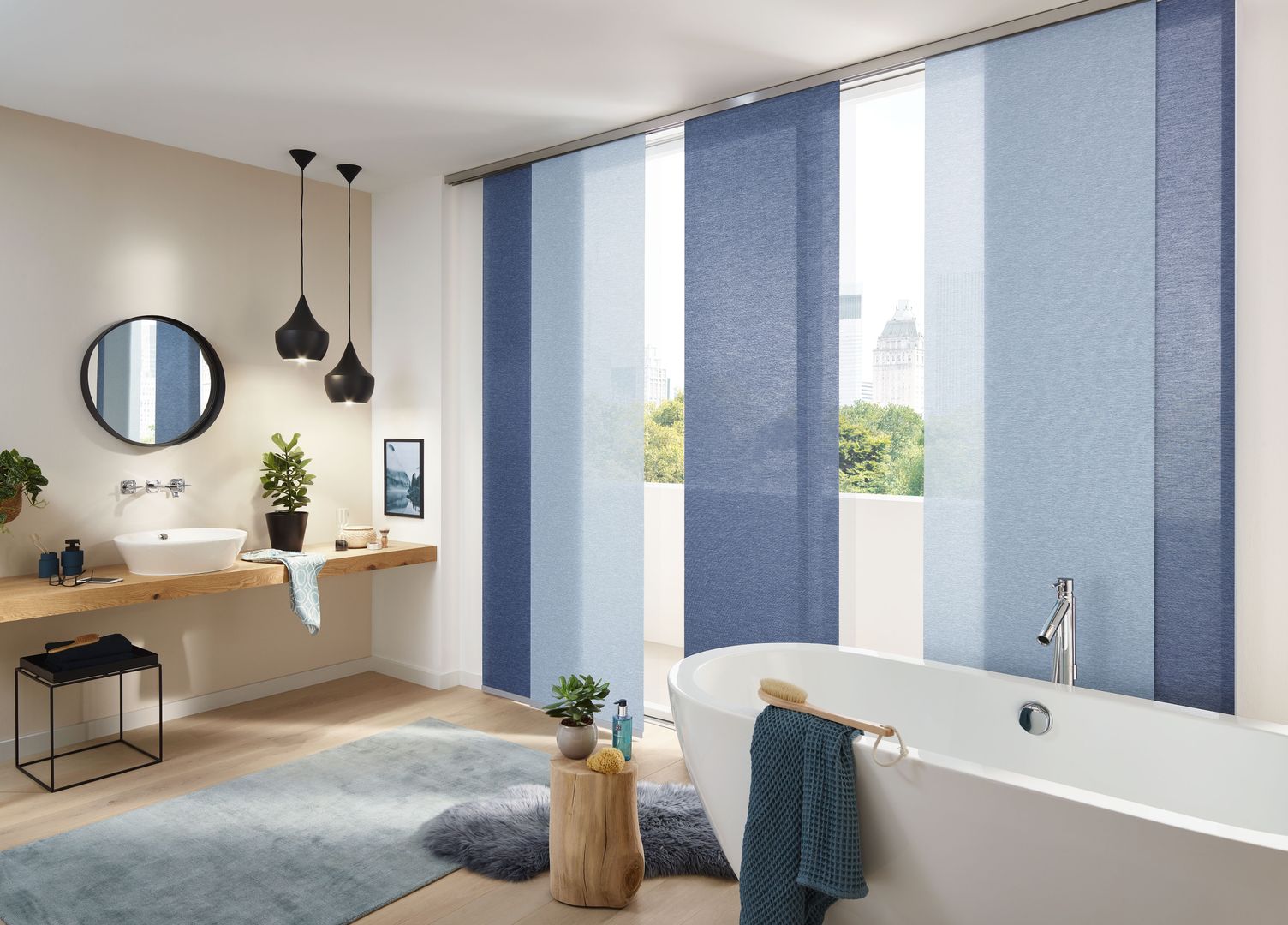 Die Paneele sind in individuellen Größen und praktisch unendlich vielen verschiedenen Stoffdesigns erhältlich. Die Paneele lassen sich einfach abnehmen und austauschen (Befestigung mittels Klettband). Die Montage der Schiebevorhänge erfolgt wahlweise an Wand oder Decke. Besonders für große Fenster, Glasfronten oder als Raumteiler bestechen Flächenvorhänge mit ihrer modernen, reduzierten Formensprache.